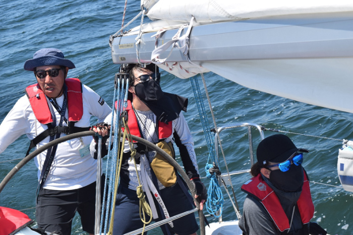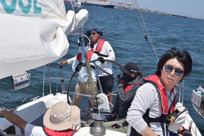 飛内インストラクターの指示で、4人の受講生が交替で艇長(ヘルムスマン)、メインセールトリマー(メインセール担当)、ポートジブトリマー(左舷ジブシート)、スターボードジブトリマー(右舷ジブシート)と役割分担し、クローズホールド、ビームリーチ、ブロードリーチと風に合わせて走らせるのだが、4人が其々の仕事を理解し、確実に実行しないとうまく操船できないことを肌で感じる。